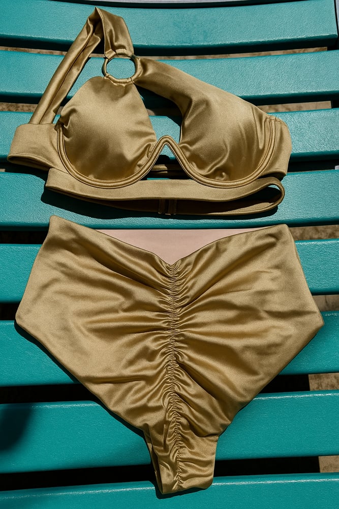 With underwire support, a high-waisted fit, and ruched back detail, this golden bikini sculpts and shines in all the right places.